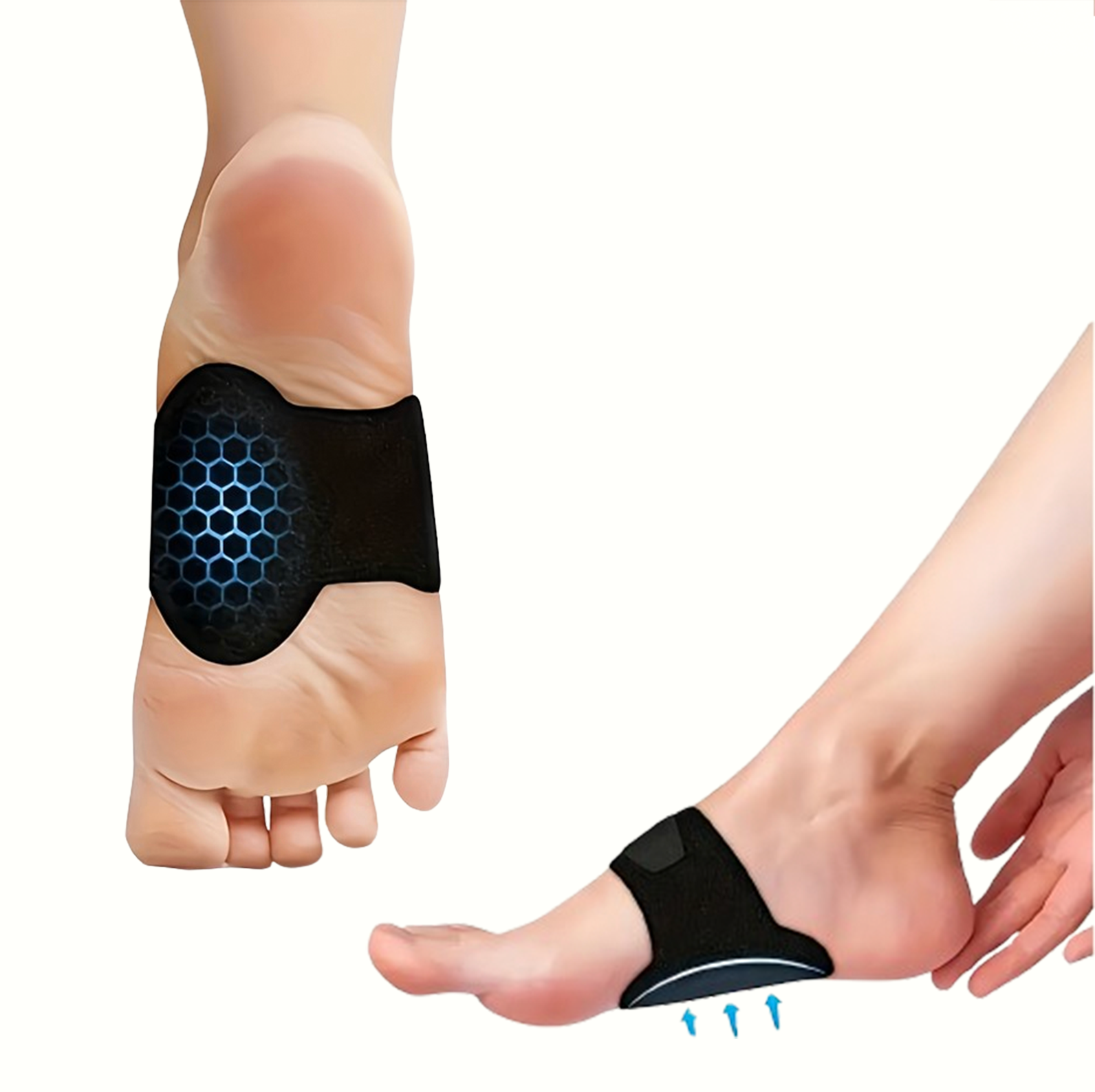 Bløde og ergonomiske buestøtter, der aflaster svangen og bidrager til at stabilisere foden under gang og stående Den støddæmpende pude reducerer belastningen og giver en lettere, mere afslappet følelse for hvert skridt Fremstillet i åndbart, elastisk materiale, der sidder behageligt i alle typer sko – både til hverdag og træning