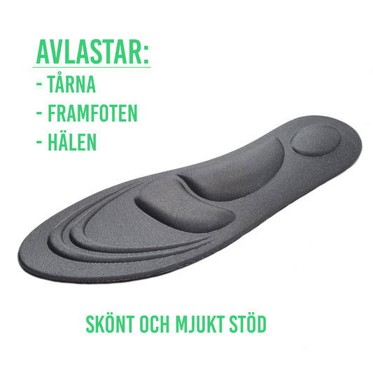 - Indlæg og ortopædiske såler: Skræddersyede såler giver støtte og aflaster hælen.